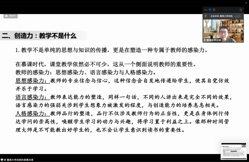 随后,田明教授围绕“创造力:教学不是什么”从四个方面进行了富有哲理的阐释:教学不是单纯的思想与知识的传播,更是塑造一种专属于教师的感染力;教学不是单向度的灌输过程,更是一种教师聆听能力的塑造;教学不仅是一种理论实践,更是一种社会实践;教学不应该局限于学科的划分,应该在学科的基础上回归历史与社会。