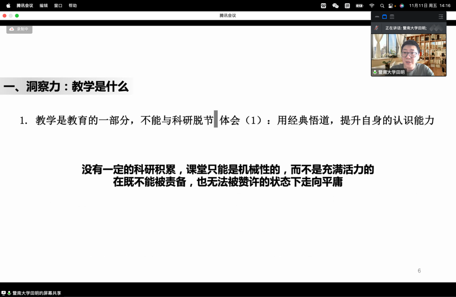 首先,田明教授结合自身经历和教学实践经验,围绕“洞察力:教学是什么”提出三个“统一”, 从注重科研积累、准确定位学生困惑、用老师的主导性回归学生的主体性、教学反哺科研等方面论证了教学和科研的统一性;从教师要站在学生角度去反思教学过程、实现教与学的化学反应讲述了教与学的统一;从教师要拥有把知识还原为思想的能力论证了知识与思想的内在统一。