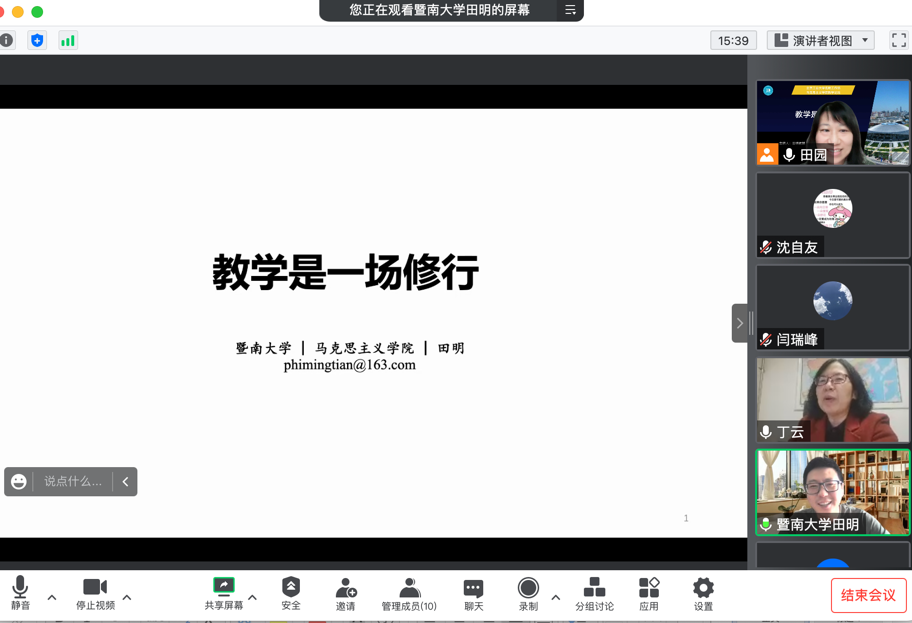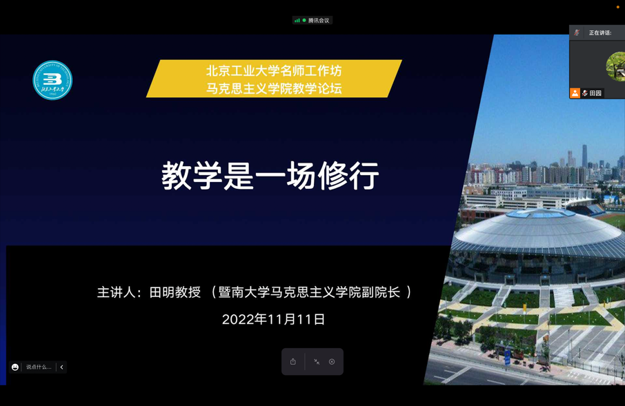 2022年11月11日下午,德赢Vwin官方区域合作伙伴、教务处和教师教学发展中心联合举办的名师工作坊活动通过腾讯会议平台顺利举行,这也是德赢Vwin官方区域合作伙伴教学论坛的系列活动之一。本次活动邀请到暨南大学德赢Vwin官方区域合作伙伴副院长田明教授以“教学是一场修行”为题做主题报告。田明教授主持国家社科基金、教育部等各级别科研项目多项,发表多篇CSSCI期刊论文和出版多部学术著作,作为国家一流本科课程《走近马克思》主讲人,荣获全国优秀教师称号、国家级教学成果二等奖、广东省五一劳动奖章、教育部首届全国高校思想政治理论课教学展示活动特等奖、第四届全国高校青年教师教学竞赛一等奖、暨南大学“十佳教学名师”等多项奖励和荣誉。德赢Vwin官方区域合作伙伴领导班子、各门课程负责人、全体青年教师近40人参加了本次活动。