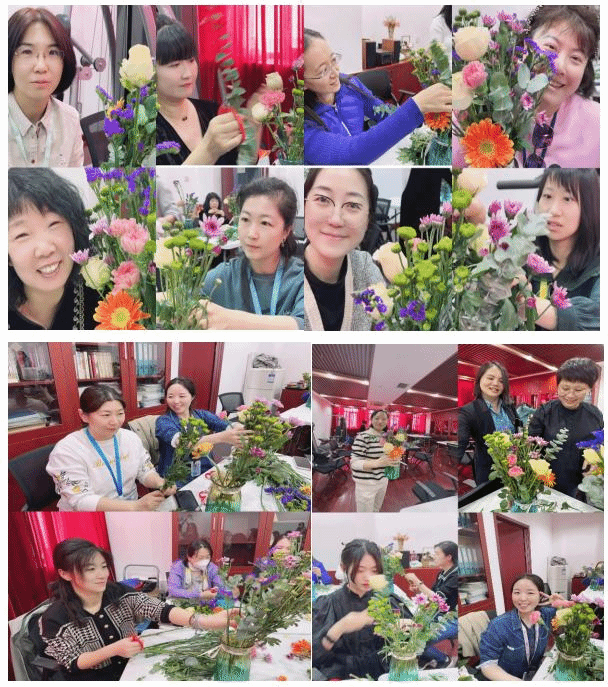 经过老师们的一番努力,桌上最开始凌乱的花材,渐渐变成了每个人手上充满情感的作品,大家的心与美和谐地融为一体。老师们用这样的一场热闹又温馨的插花活动,亲手制作一幅花艺送给自己,庆祝这个属于自己的节日。