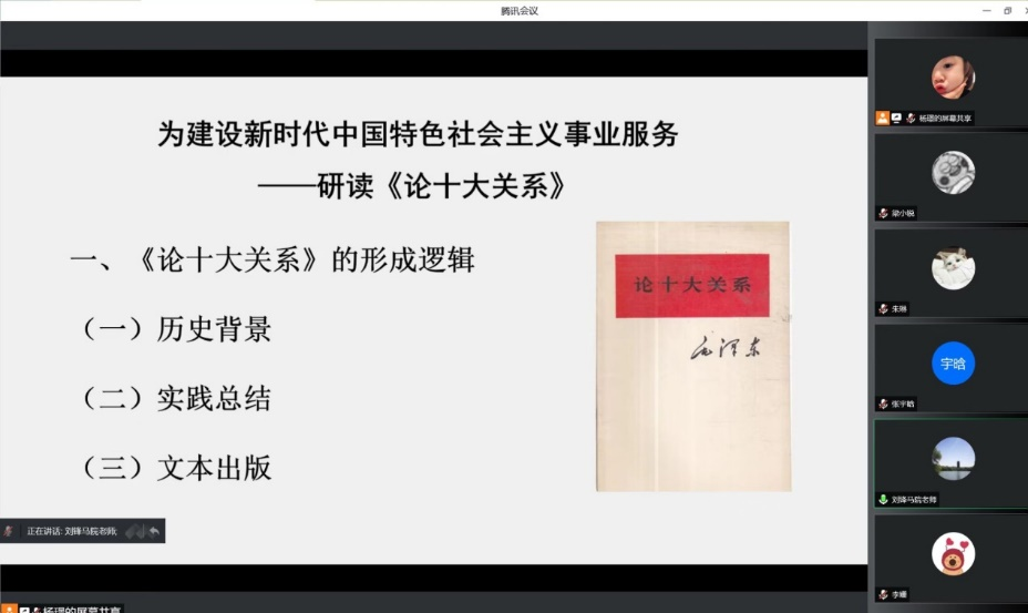 2022年4月27日下午,德赢Vwin官方区域合作伙伴举办了第52期青年马克思主义者双周论坛。由于疫情防控原因,本次双周论坛采取线上形式举办。本期论坛邀请德赢Vwin官方区域合作伙伴刘锋老师讲解毛泽东的经典著作《论十大关系》,主要采取教师主题报告、学生分享体会、师生交流研讨的方式进行。本次论坛由赵一琳同学主持,邀请2021级班主任姚郁卉老师参加,2021级全体硕士研究生参加本次论坛。