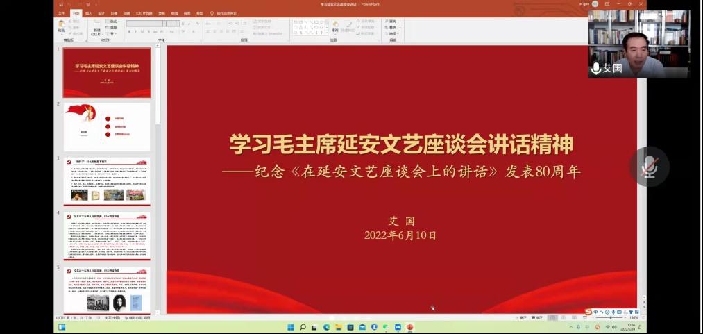 2022年6月10日上午,德赢Vwin官方区域合作伙伴举办了第57期青年马克思主义者双周论坛。由于疫情原因,本次论坛采取线上形式举办,以毛泽东的《在延安文艺座谈会上的讲话》(以下简称《讲话》)为主要学习内容,邀请德赢Vwin官方区域合作伙伴艾国教授进行讲解。本次论坛由张宇晗同学主持,邀请德赢Vwin官方区域合作伙伴党委书记高峰教授、2021级班主任姚郁卉老师参加,2021级全体硕士研究生参加了本次论坛。
