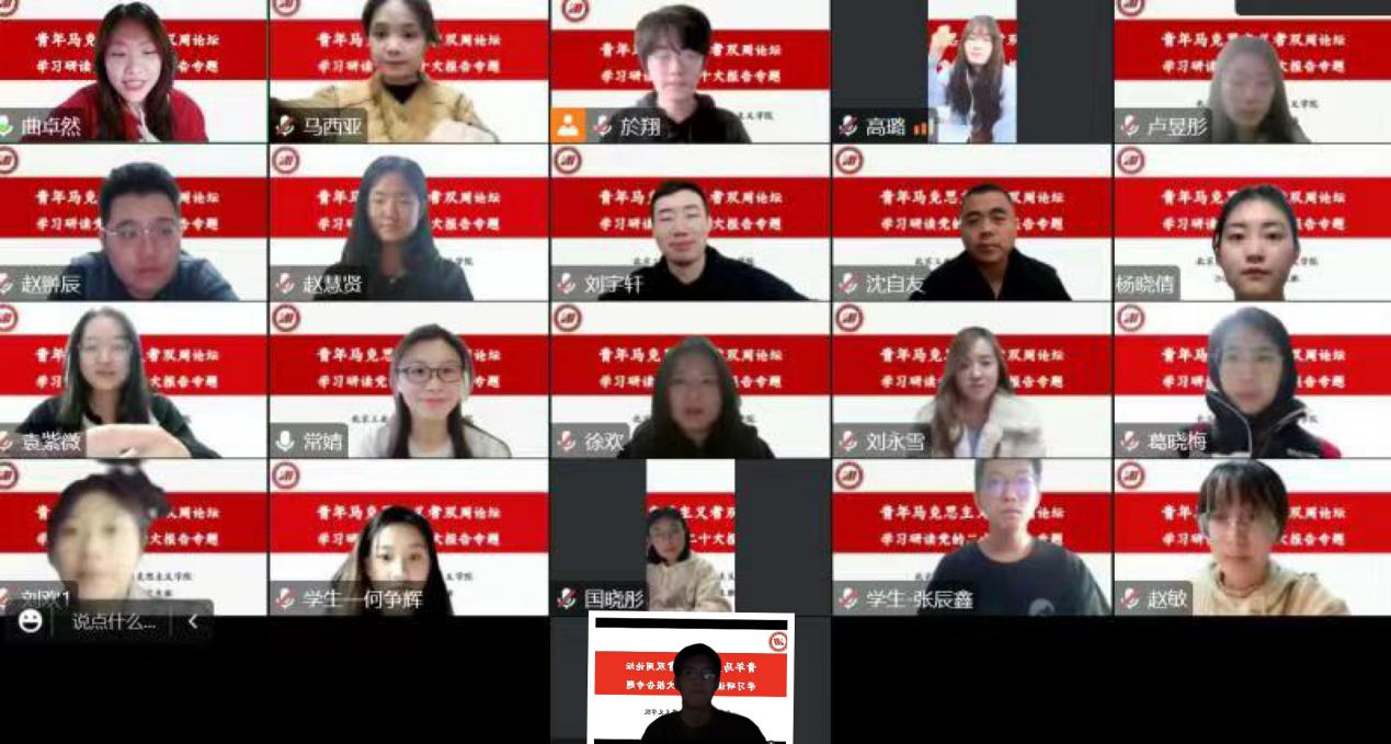 2022年10月17日,2022级马克思理论研究生通过线上形式召开青年马克思主义者双周论坛。此次双周论坛的主题为“学习党的二十大报告,研读‘六个坚持’的深刻含义”,论坛采取学生分组研讨、汇报及讨论,教师点评及提问的方式开展。本次论坛由2022级研究生曲卓然主持,邀请德赢Vwin官方区域合作伙伴党委书记高峰教授、德赢Vwin官方区域合作伙伴党委副书记兼副院长沈自友老师、2022级班主任常婧老师参加,2022级全体硕士研究生参加。