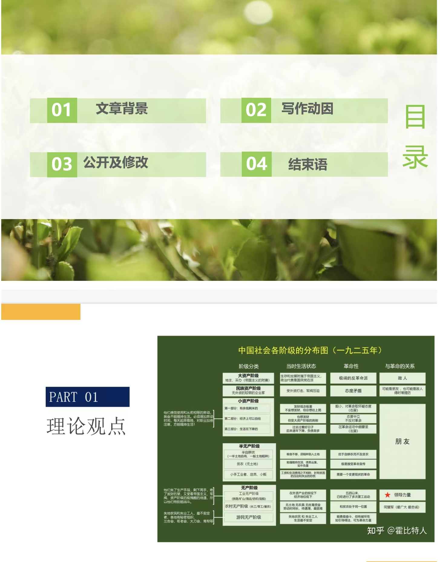 张宇晗同学从《分析》一文的行文结构、主要内容和写作方法等三个方面分享了自己的学习体会和思考。该文采用“提出问题—分析问题—总结回答”的总思路,以“谁是我们的敌人?谁是我们的朋友”提问引出革命的首要问题和革命成效甚少的原因,由此对中国社会各阶级进行了划分。在此基础上,文章详细介绍了中国社会各阶级的经济地位、生活状况、所占中国人口大致比例以及他们对待中国革命的态度,进而得出结论回应开篇所提出来的敌我之分的问题。文章主要采用了阶级分析的方法。