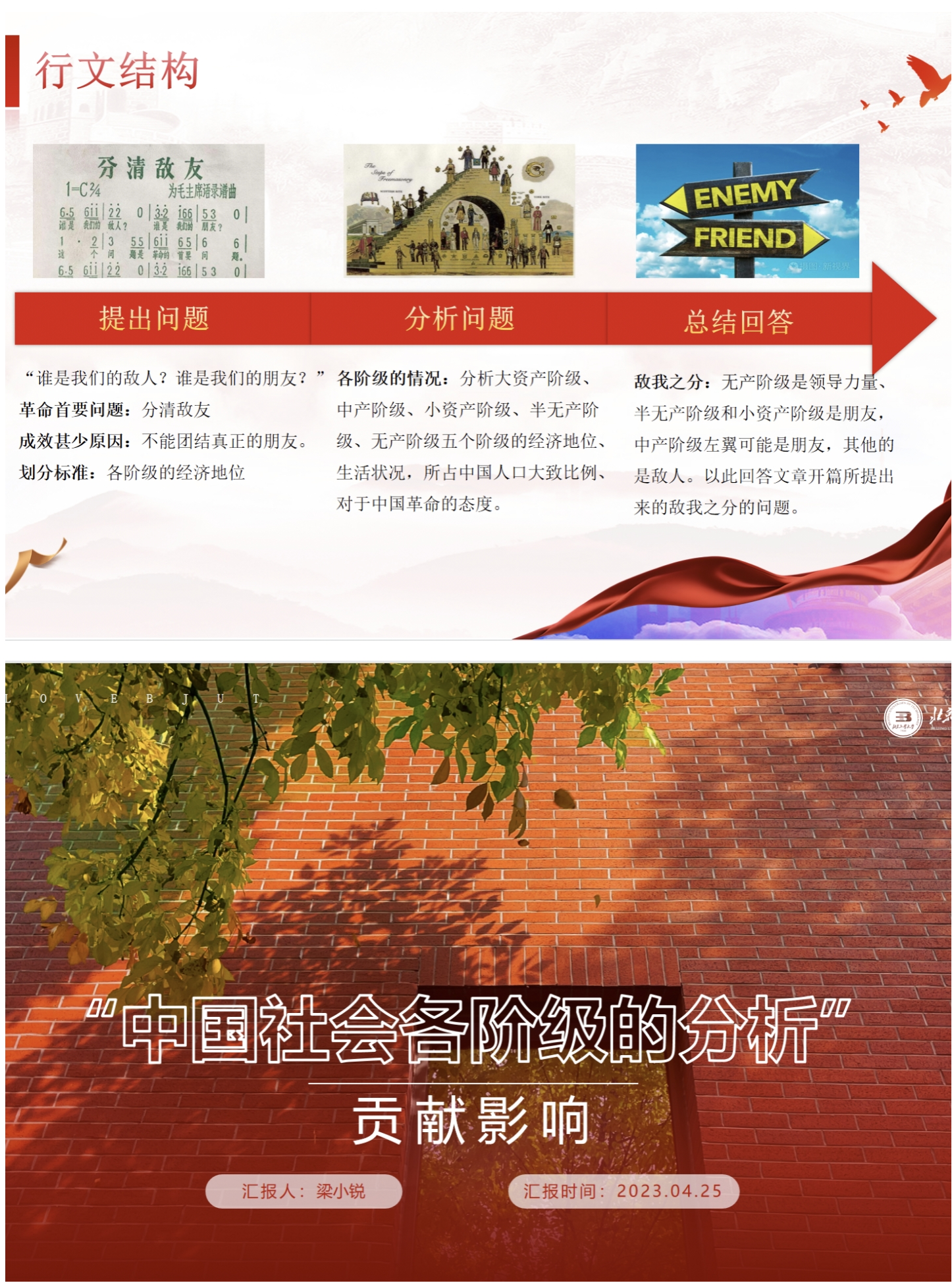 梁小锐同学对《分析》一文的贡献影响进行了阐发。她认为,毛泽东把马克思列宁主义基本原理同中国革命的具体实践初步结合起来,从中国的历史和现实状况出发,实事求是地分析了中国社会各阶级的地位、相互关系以及对待革命的态度,初步提出新民主主义革命的基本思想;文章也是“两大革命”取得胜利的重要理论指引;毛泽东应用马克思主义的阶级分析方法,对中国社会各阶级的经济地位和政治态度做了具体分析,使思想政治教育工作对象清晰、目标明确、有的放矢,为有针对性地开展思想政治教育提供基本遵循;阶级阶层分析法在新时代具有重要意义等。