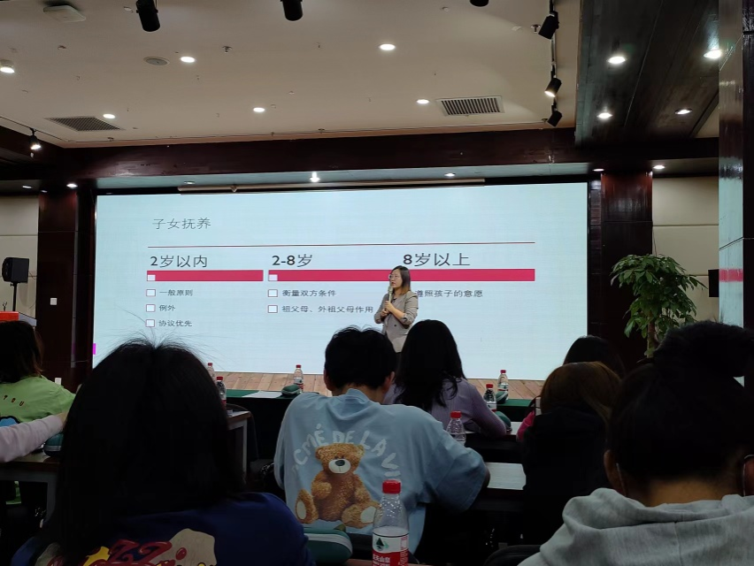 参观结束后,开始普法讲座。京师律师事务所合伙人律师徐秋梨女士就《民法典》中的结婚与离婚给大家进行细致讲解。首先关于结婚,她主要讲了身份和财产两部分,例如何为近亲、结婚登记必须由本人亲自到场、重婚现象为何会发生、何为夫妻共同财产等。最后关于离婚,主要涉及离婚关系解除的几种条件、子女抚养权争夺的时间节点、财产分割等。许律师借助相关案例分析来解释法律条文,使得讲座生动且便于理解。