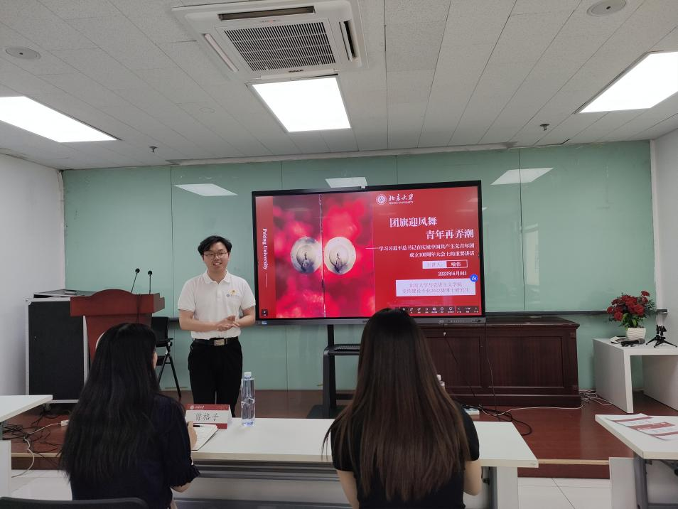 北京大学德赢Vwin官方区域合作伙伴研究生讲师团成员喻伟以《团旗迎风舞,青年再弄潮——学习习近平总书记在庆祝中国共产主义青年团成立100周年大会上的重要讲话》为题,通过总结“四时期,四经验”,从共青团百年名称变迁,四个历史时期的青年运动史,共青团面向未来的四条重要经验和习近平总书记对共青团、共青团员和团干部的殷切希望四个方面深刻剖析了习近平总书记在庆祝建团100周年大会上的重要讲话精神,深入解读习近平总书记的重要讲话精神。宣讲主要从“百年风华、回望过去、面向未来、领袖希望、青年要点、争当先锋”六个维度展开,首先从历史角度阐述了中国共青团带领中国青年取得的一系列成就;其次揭示了百年征程给共青团带来的宝贵历史经验,从价值论、本质论、方法论和整体论四个角度总结了习总书记对当代青年的期望;最后以“寄语青年,争当先锋,再创辉煌”,勉励青年学子学真本领、干实在事,为强国建设、民族复兴贡献青春之力。