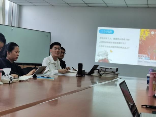 在交流环节,同学们针对三个问题依次分享了自己的心得。韩天泽同学重点强调了手脚分工、社会协作和语言在从猿到人的转变中的作用。牛晶晶同学认为人类社会区别于猿群根本上在于劳动,而劳动是从制造工具开始的,劳动工具的产生推动了社会发展。杨智慧同学联系当下社会热点事件阐述了人与自然的一体化特征,强调社会变革对解决人与自然矛盾的重要作用。
